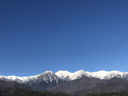 澄み切った空気で蒼い空と白銀の峰々。越百山・南駒ケ岳・空木岳の景色に心があらわれる思いです